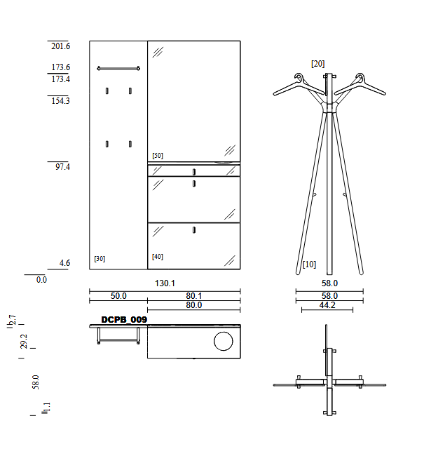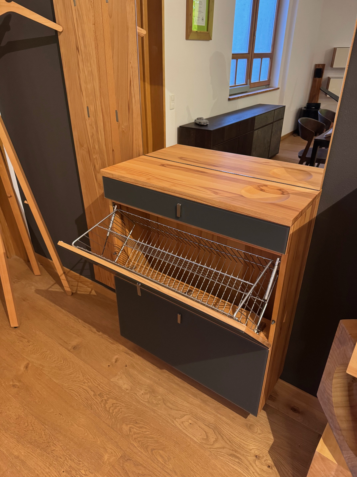 Garderobe in Kernbuche geölt Wandpaneel mit Stange und Kleiderhaken, Spiegel und Hängeschrank mit Schublade und 2 Klappen Kleiderständer hood mit drei Kleiderbügeln
