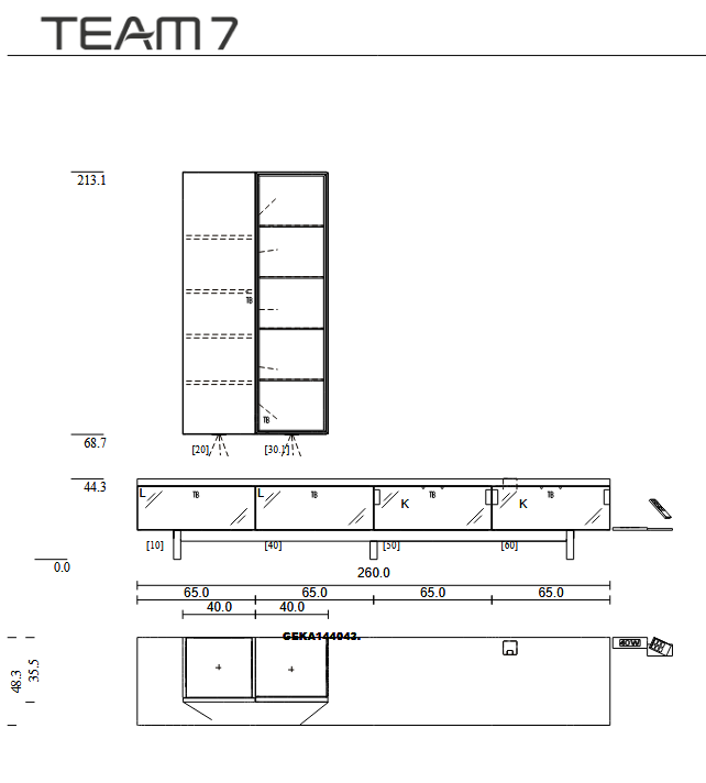TEAM 7 Wohnwand, Eiche geölt, Glas bronze matt Lowboard: links zwei Schubläden rechts zwei Klappen Hängekorpus: hinter den Türen Fächer